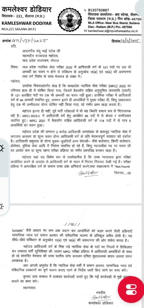 मध्य प्रदेश की न्यायिक सेवा भर्ती प्रक्रिया पर अब सियासी और सामाजिक तूफान खड़ा हो गया है। भारत आदिवासी पार्टी (BAP) के विधायक कमलेश्वर डोडियार ने आज महामहिम राज्यपाल मंगू भाई पटेल के नाम से एक विस्तृत आवेदन (क्रमांक 471/VIP/2025) राज्यपाल भवन को सौंपा है। इस आवेदन में मध्य प्रदेश न्यायिक सेवा परीक्षा (MPCJ) 2022 के परिणामों को संविधान के अनुच्छेद 15(4) एवं 16(4) की प्रत्यक्ष अवमानना बताते हुए आदिवासी वर्ग (अनुसूचित जनजाति – ST) के प्रति व्यवस्थित भेदभाव का आरोप लगाया गया है। विधायक डोडियार ने स्पष्ट किया कि यह आवेदन आदिवासी समुदाय के हित में आदरणीय मंगू भाई पटेल जी के नाम से प्रस्तुत किया गया है, जो राज्य के आदिवासी समाज की पीड़ा को व्यक्त करता है।